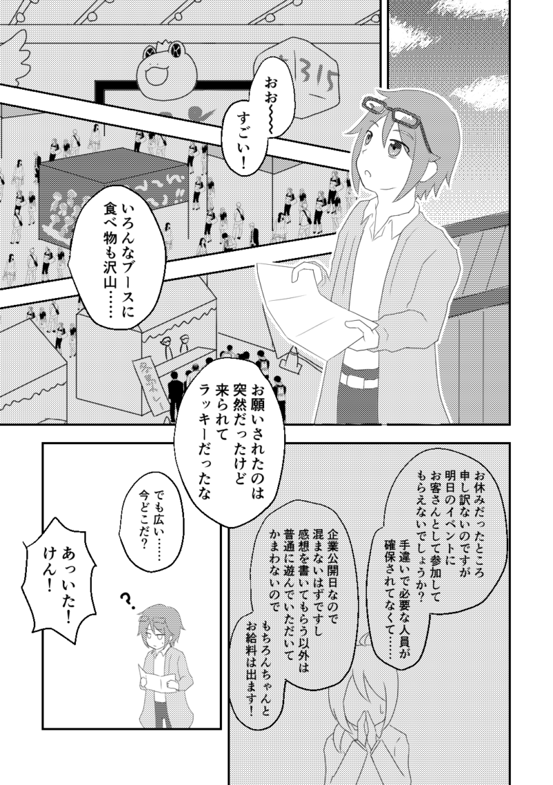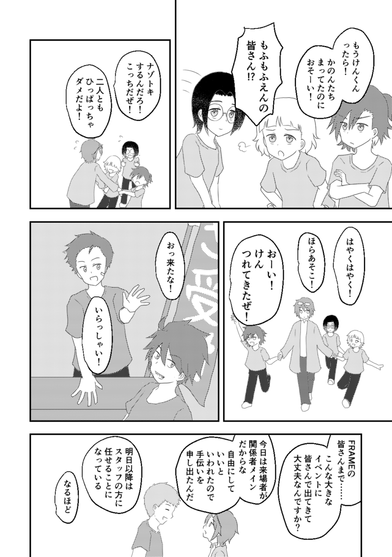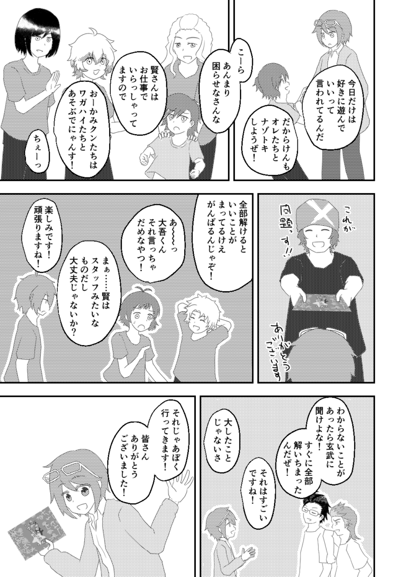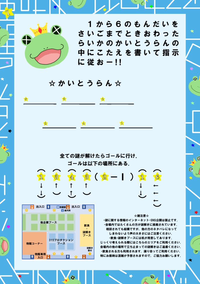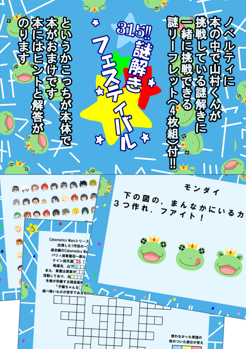 315!!謎解きフェスティバル 同人誌 2024.02.04 同人誌 sideM同人誌謎解き・パズル お気に入り 315プロ主催の謎解きイベントに山村くんが挑戦する本です。本文中に出てくる謎解きリーフレットが付属していて、実際に謎解きに挑戦できます。本は漫画・ヒントと解答ページに分かれていて、解きなれていない方でもなんとかなると思います。謎はリーフレットだけで完結して解けるので、得意な方は本を開かずに挑戦してみてください! 通販はこちら(booth) 通販はこちら(booth) お気に入り