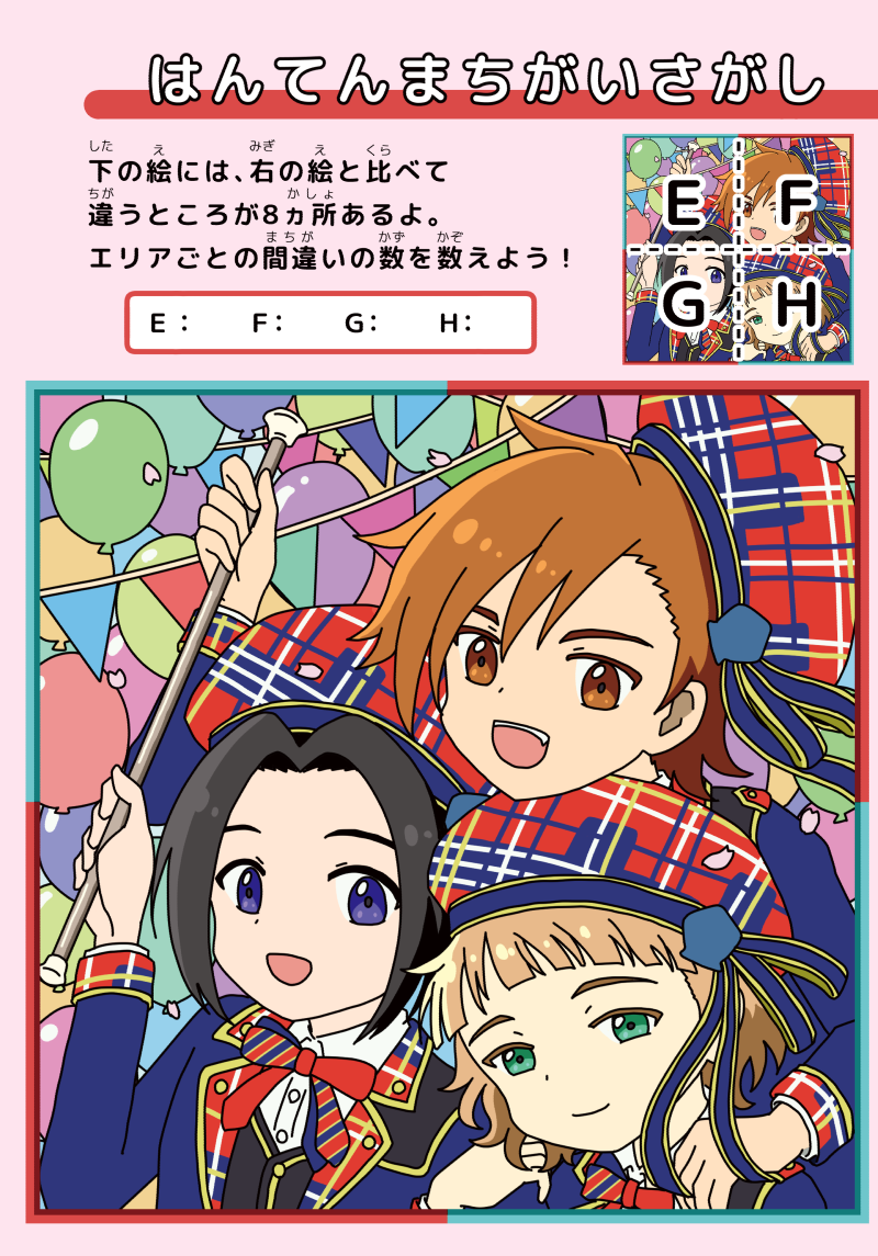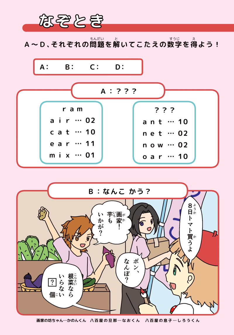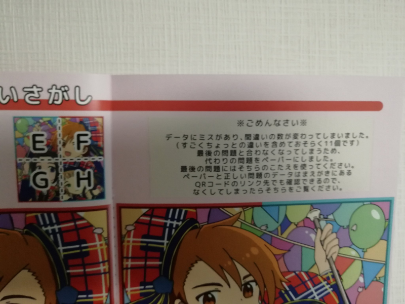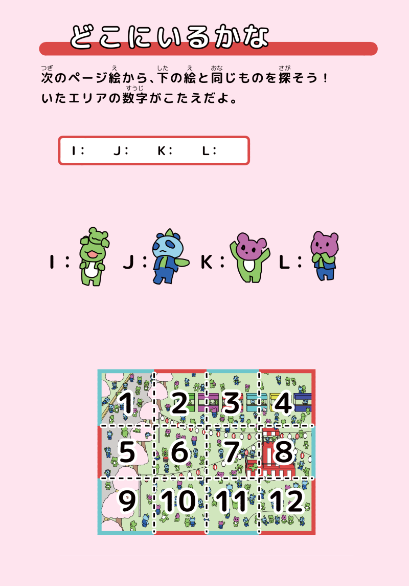 同人誌もふもふえんが知育本のお仕事をしたというコンセプトの本です。間違い探しや迷路、謎解きなどを少しずつ収録しています。直接描きこんで遊べるようになっています。ヒントや答えは本に載っているリンク先(QRコードあり)から参照できます。二つある間違い探しのうちの片方にミスがあったので、該当ページにシールを張り付けてお知らせ・本に載っているリンクに正しい画像の掲載・代わりの問題のペーパーを同封しています。